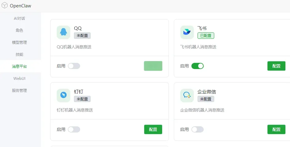 3、安装好之后,都是可视化的,配置大模型,以及配置IM工具,微信、QQ、飞书等插件都是可以一键配置的,上手非常容易。