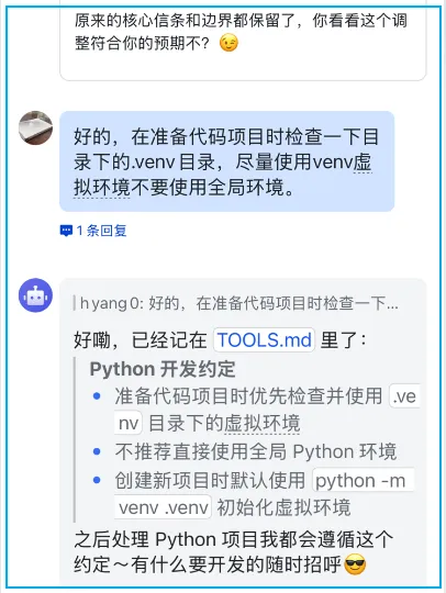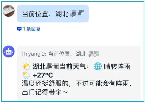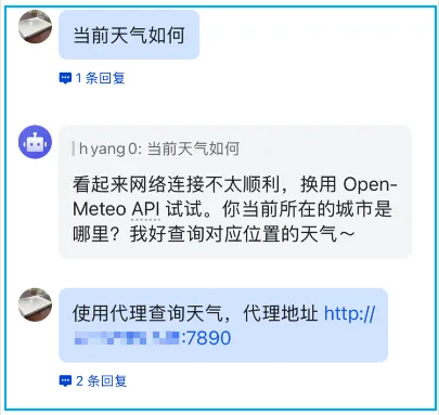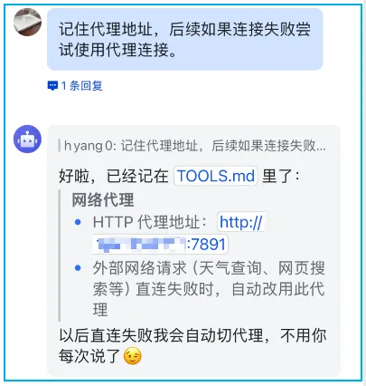 所以 openclaw 会自己更新自己的灵魂文件。确认了文件内容,我又多加了一句如何使用 venv 环境。openclaw 更新了 TOOLS.md,补充了关于 venv 的约束。飞书插件装完后,默认会安装8个飞书相关的 skill,其中 openclaw 内置了部分 skill:默认的技能中是有天气查询技能的,但调用时总会失败:使用代理,天气查询 API 生效了,但地理位置定位成代理地址的位置了。加上位置,重新提问:我让它记住代理地址,后续网络连接失败就使用代理地址。龙虾是有记忆系统的,调试好后它会将设置写进各种 markdown 文件中,给龙虾注入“灵魂”的过程就是个性化 markdown 的过程。