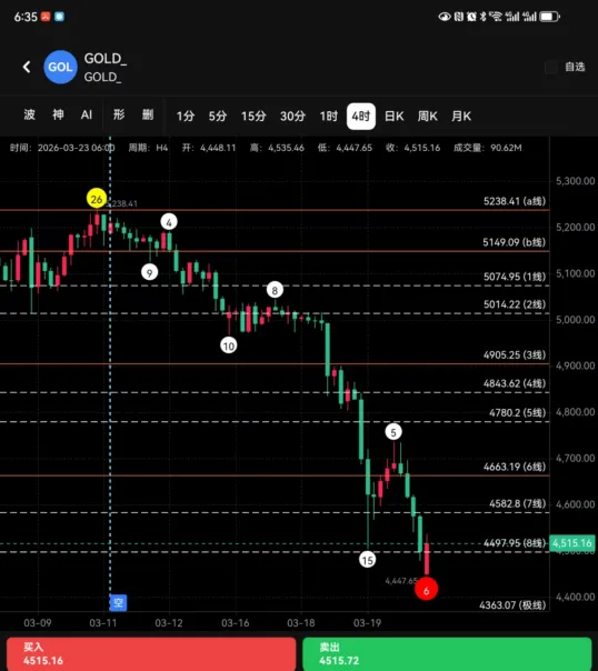 2、再看4小时图根据实际行情的变化。他已经自动改变了箱体测量位置。目前下跌6柱(变盘数字)已经跌到8-9线(反弹线位)时空共振开始反弹。