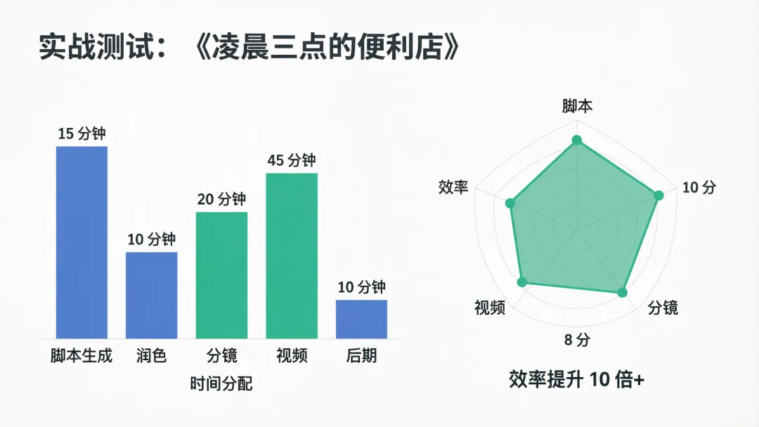 为了验证这套工作流,我做了个测试:用约 1 小时完成一集 60 秒短漫剧的从 0 到 1。