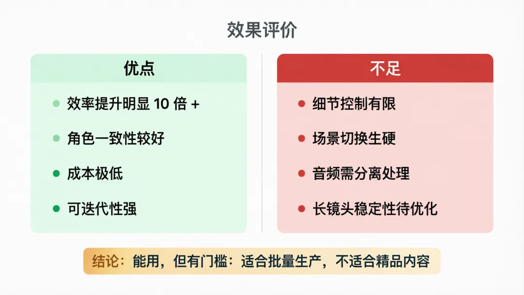 当然,它也有一些限制:生成时间较长,需要多模态模型支持,不同部署环境可能有差异。