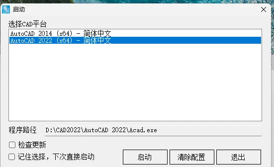 D:\Program Files\Autodesk\Auto CAD 2022\Acad.exe(若路径不符请手动定位)。可勾选「记住选择,下次直接启动」,取消「检查更新」,点击【启动】。