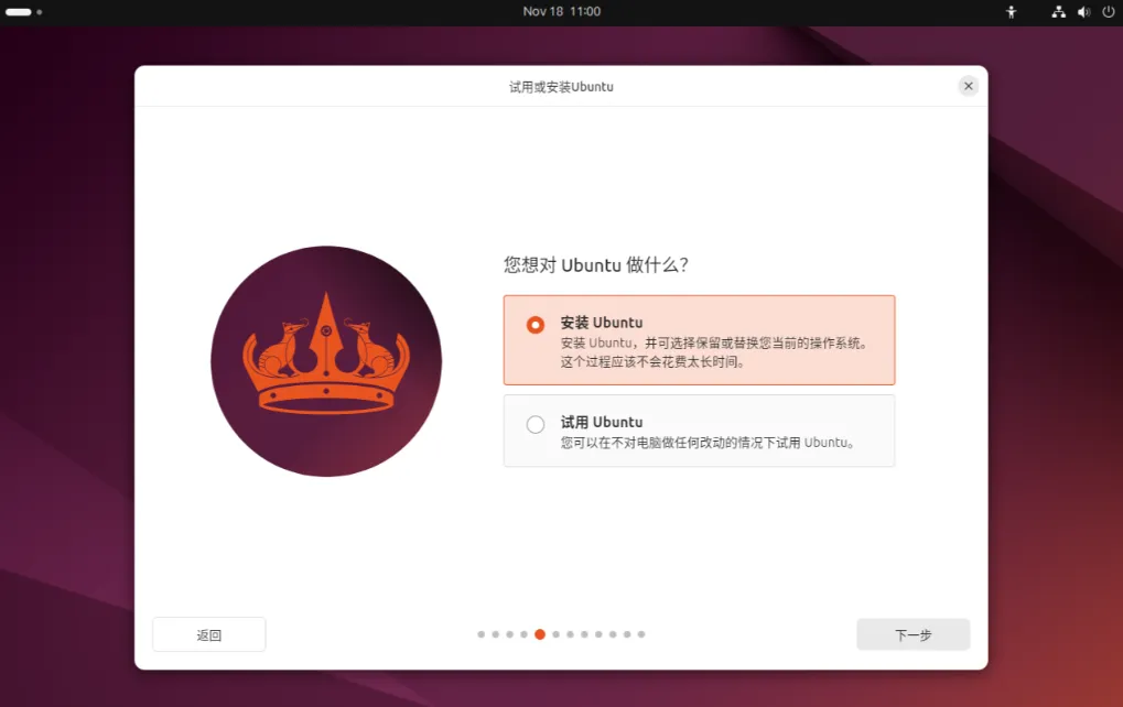• 进入Ubuntu安装界面,选择「清除磁盘并安装Ubuntu」