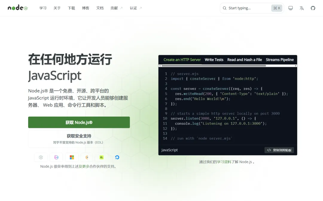 点击主页上的「获取NODE.JS」按钮下载,安装一路点「下一步」即可。