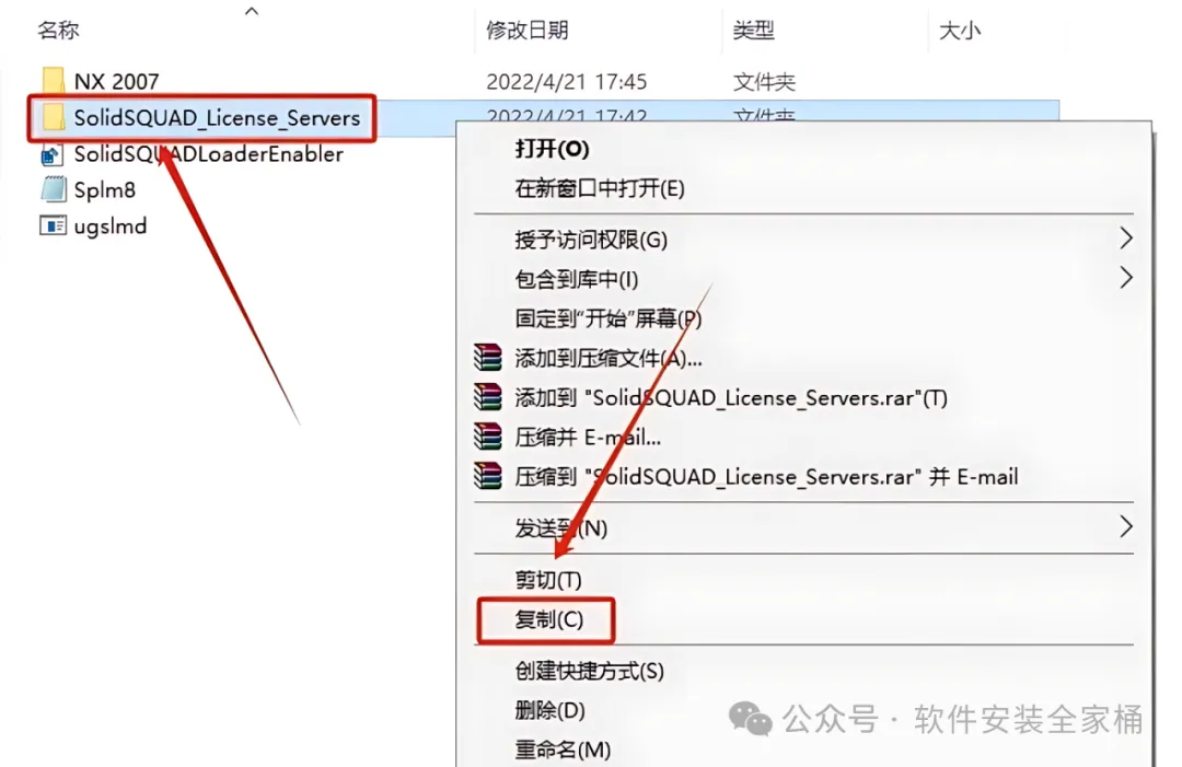 4.鼠标右击【SolidSQUAD_License_Servers】文件夹选择【复制】。