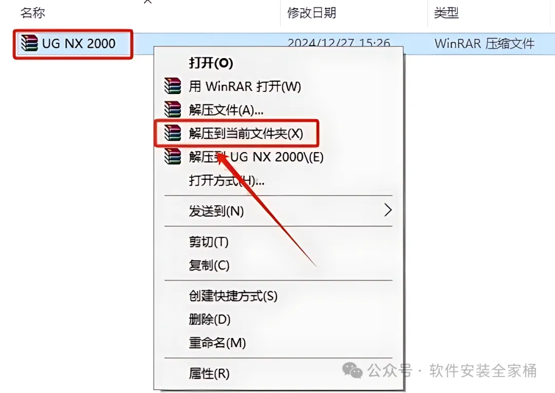 1.打开下载的UG安装包,鼠标右击压缩包,选择【解压到当前文件夹】。