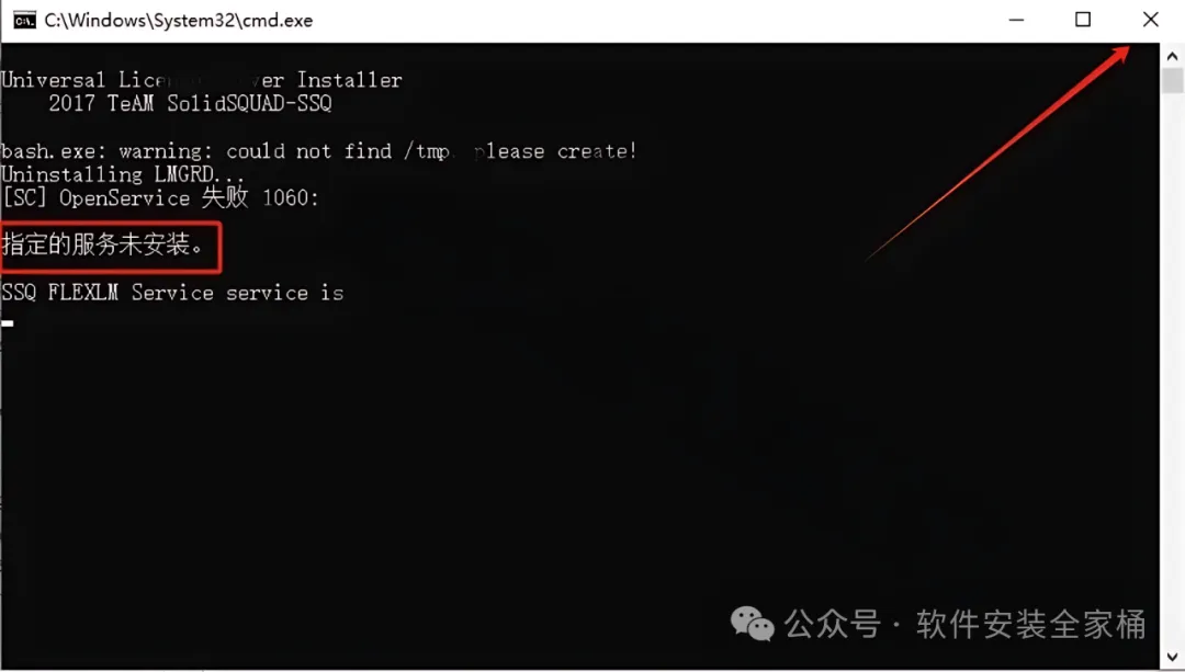 9.如果显示【指定的服务未安装】,就关闭此窗口,如果显示【NX许可服务已安装完成】,那么关闭此窗口后直接进行第12步骤。
