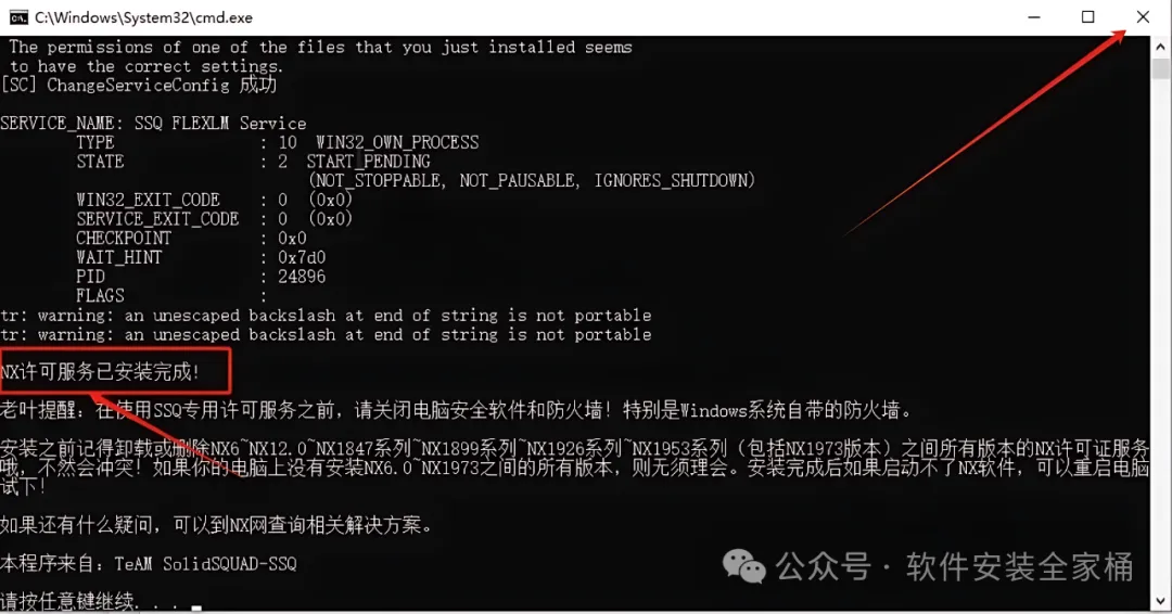 11.显示【NX许可服务已安装完成】,关闭此窗口。