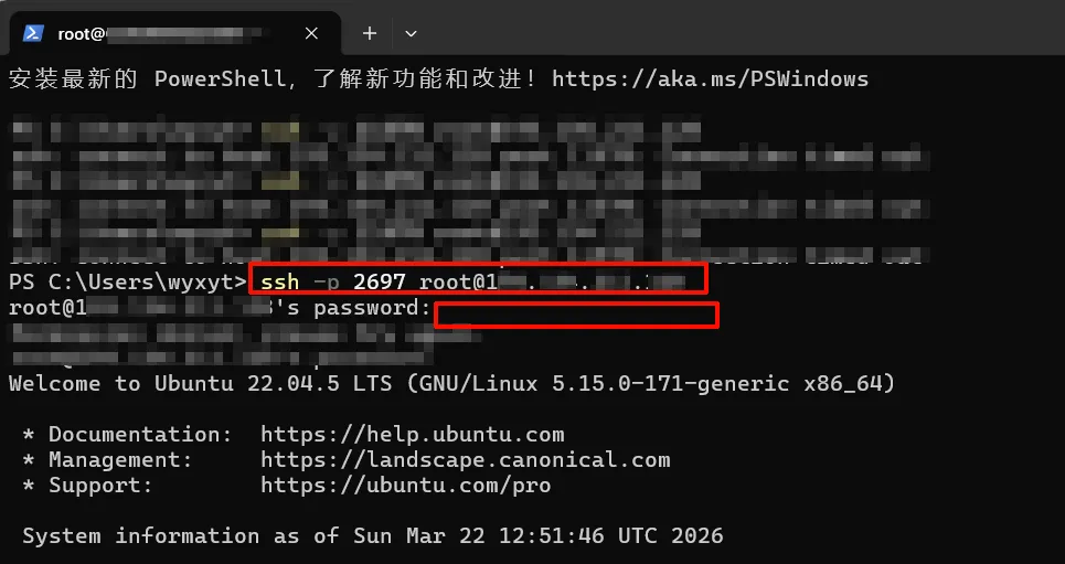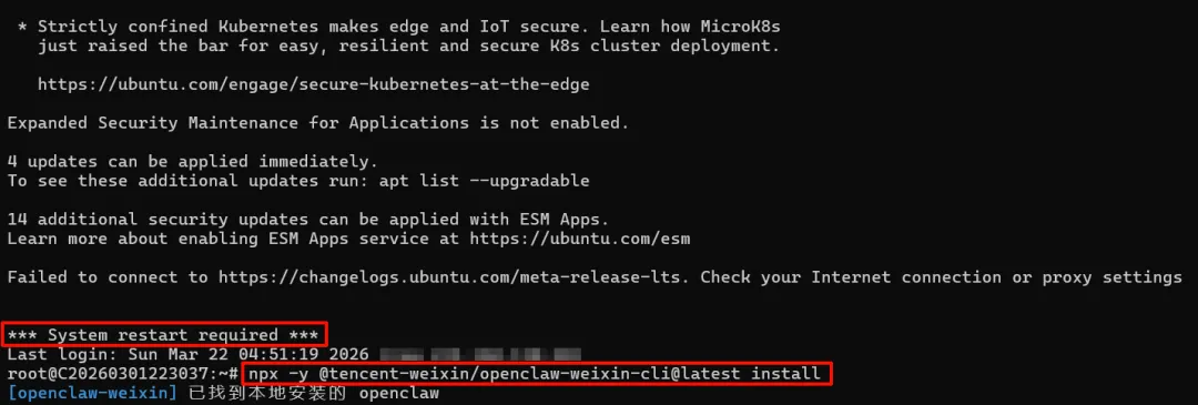 当终端中出现 *** System restart required *** 或类似的提示时,说明你已经成功登录服务器,可以继续下一步了。