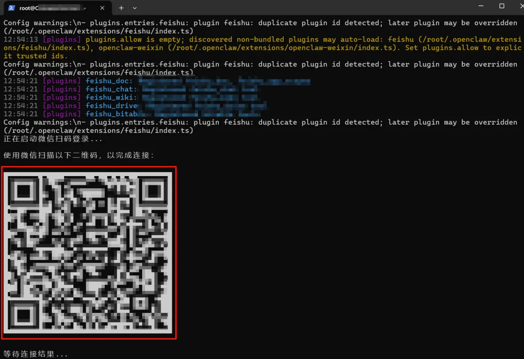 稍等片刻,终端里会生成一个二维码。用微信扫描二维码即可完成连接