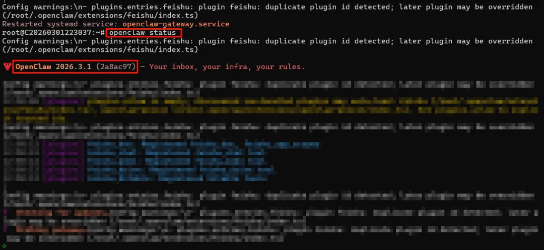 在终端输入openclaw status,点击回车