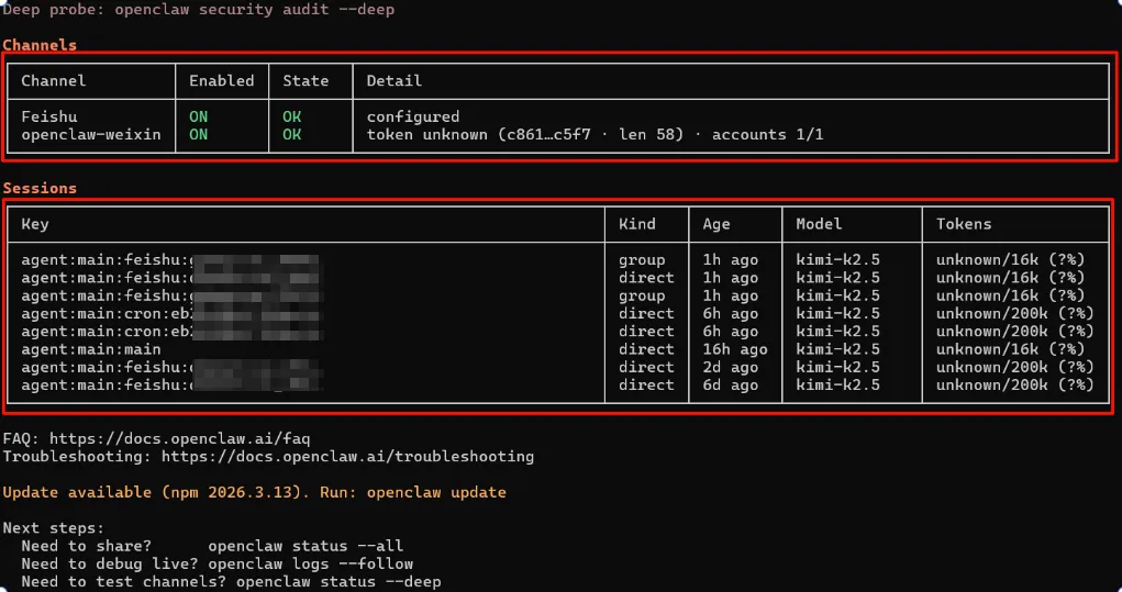 你会看到你已接入的Channel,飞书和微信,ON的状态就说明是正常的。