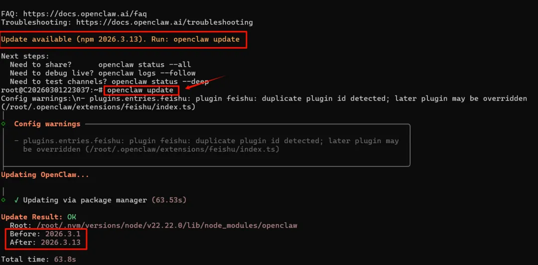 在终端输入openclaw update,然后回车,系统就会更新。