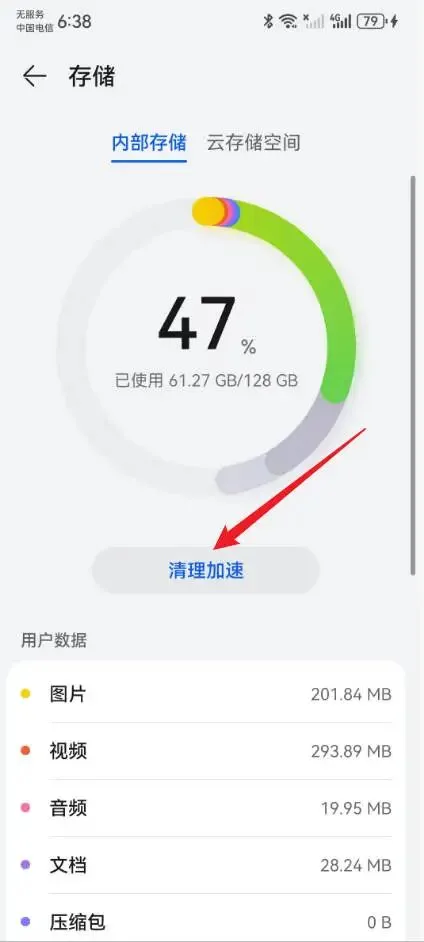 2、进入到存储页面,点击“清理加速”。