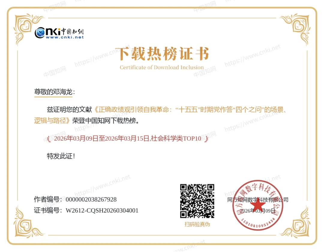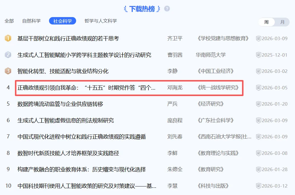 根据中国知网的数据,《统一战线学研究》首发论文《正确政绩观引领自我革命:“十五五”时期党作答“四个之问”的场景、逻辑与路径》(作者:邓海龙,首发时间:2026-03-05 14:23),荣登中国知网下载周热榜。截至2026年3月22日,该文在中国知网已被下载2644次。
