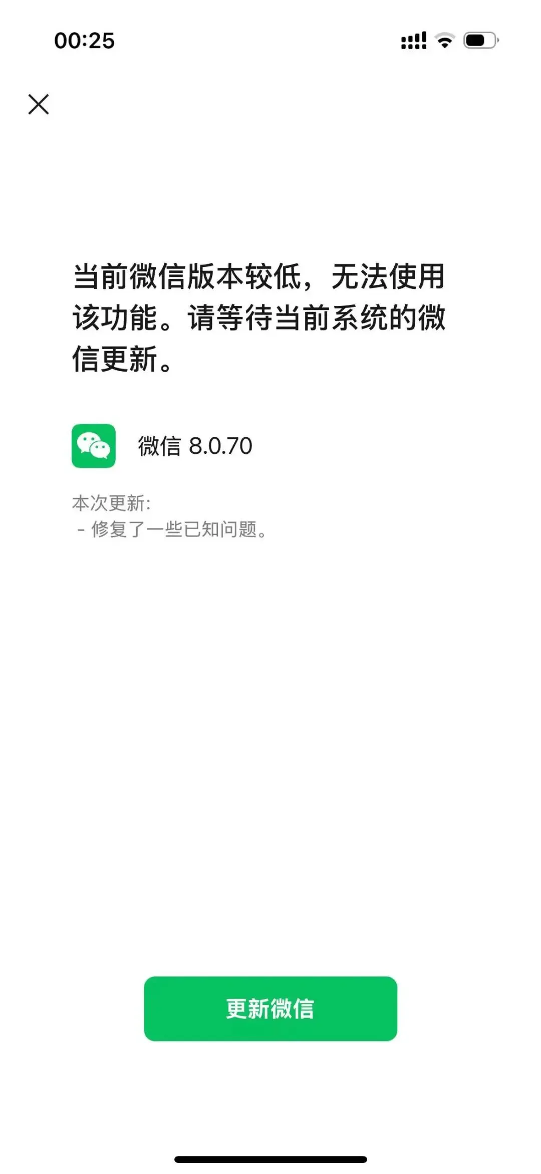 升级你的微信版本:微信版本不能太老,实测需要更新到 微信 8.0.70 及以上。否则扫码后会提示“当前微信版本较低,无法使用该功能”。