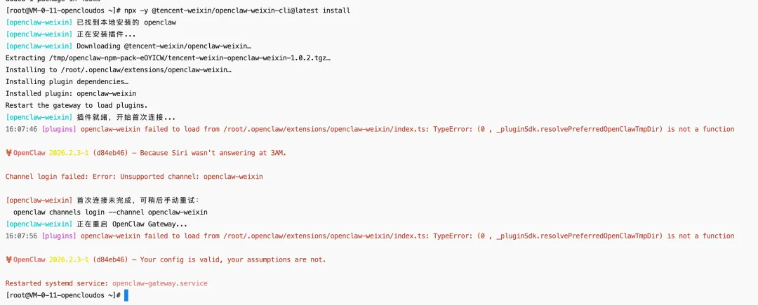 安装openclaw的微信插件:npx -y@tencent-weixin/openclaw-weixin-cli@latest install