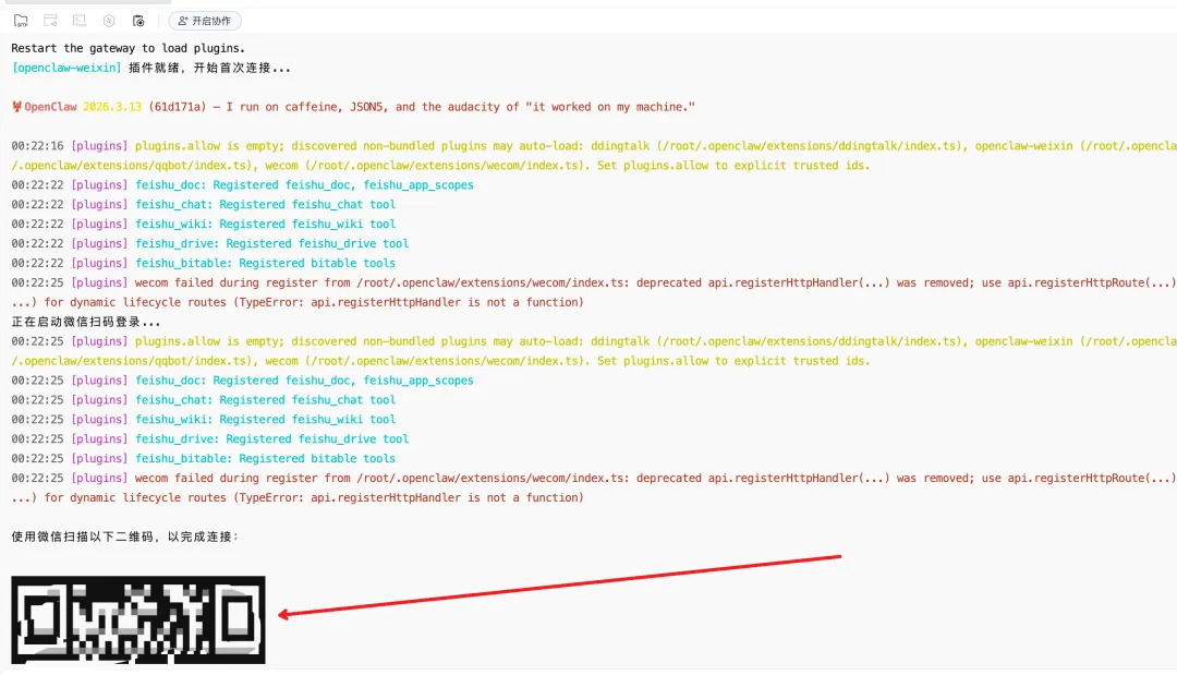 插件安装并加载完成后,终端会直接弹出一个 二维码。