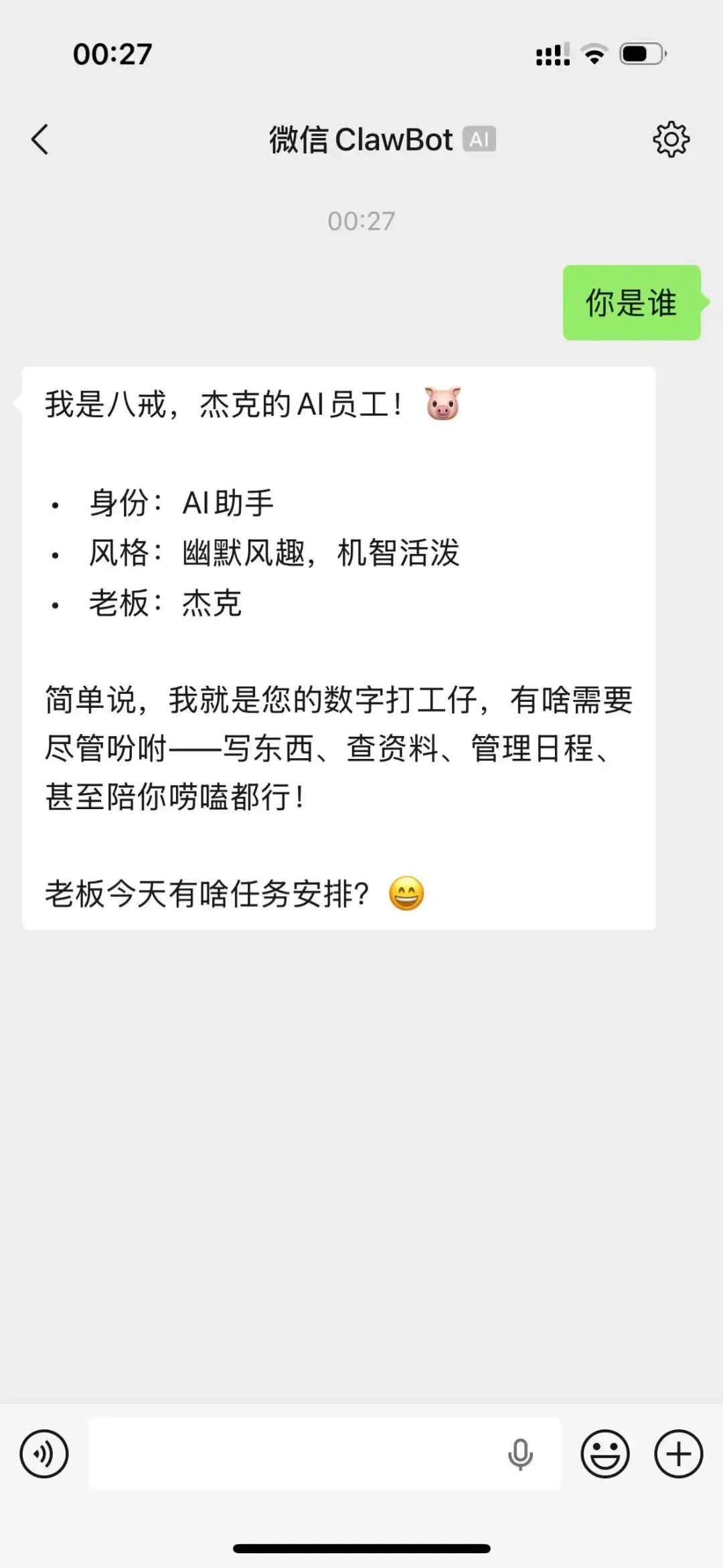 这就是你与 OpenClaw 专属的消息通道。你可以像和一个真实员工聊天一样,给它设定人设。比如我给它设定了“八戒”的身份,它不仅能幽默风趣地接梗,还能帮你写东西、查资料、管理日程,甚至陪你唠嗑。