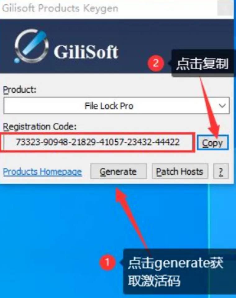 运行注册机,在列表中找到“File Lock Pro”,点击“Generate”生成激活码,复制它。