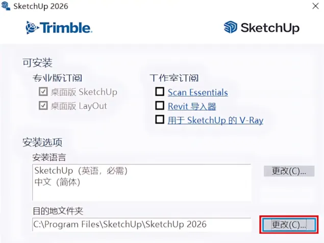 2、更改安装路径,建议改到D盘或者E盘,记得新建一个文件夹(不能含有中文名),可以命名:SketchUp 2026
