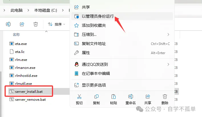 26、打开粘贴完成的ETA_RLM_Server文件夹,右键以管理员身份运行server install.bat