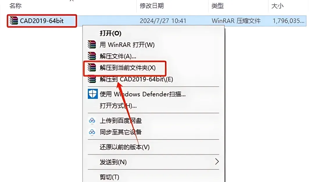 1.打开下载好的CAD安装包,然后鼠标右击压缩包,选择【解压到当前文件夹】。