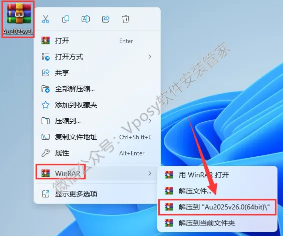 1.解压安装包:①鼠标右击【Au2026v26.0(64bit)】压缩包②选择电脑上安装的解压软件(如:WinRAR)③点击【解压到Au2026v26.0(64bit)】。