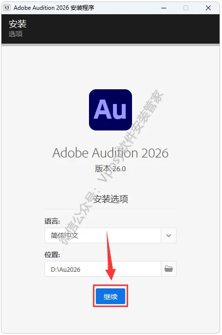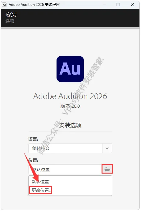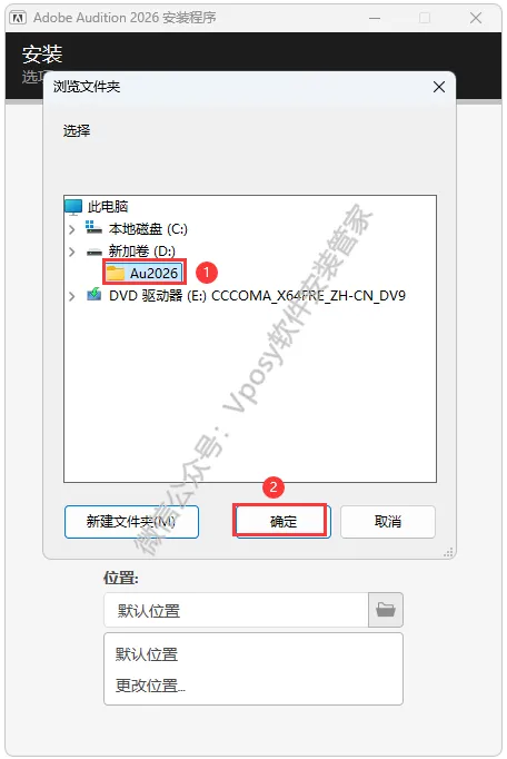 4.修改安装位置:①点击需要将软件安装的磁盘位置(如:D盘),新建一个【Au2026】文件夹并选中②点击【确定】。