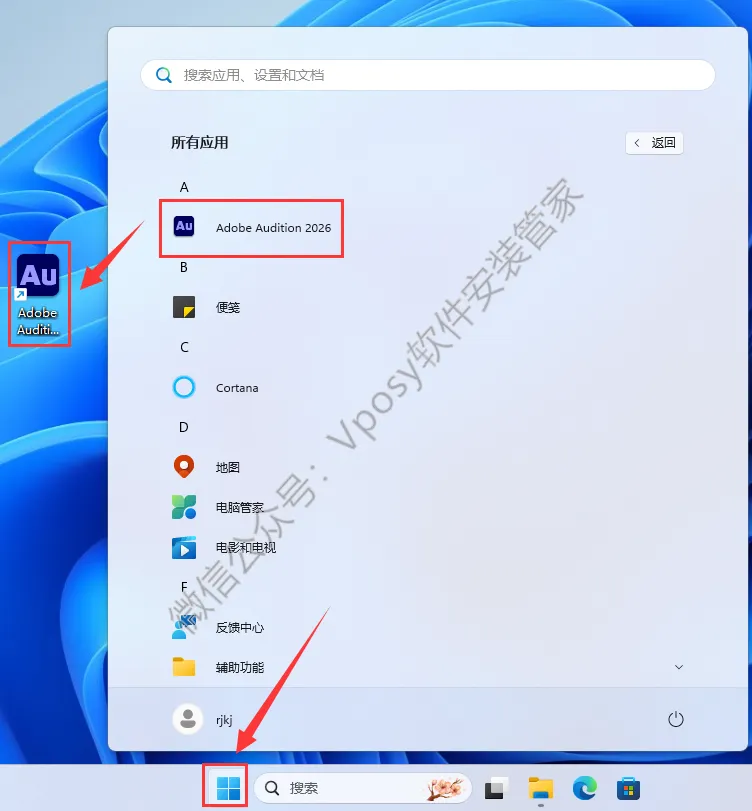 8.创建桌面快捷方式:点击桌面任务栏中的【开始图标】>点击【所有应用】,将【Adobe Audition 2026】图标拖到电脑桌面。