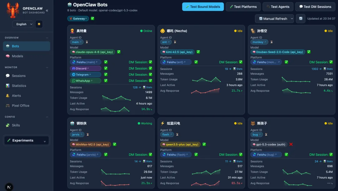 卡片墙展示所有机器人,每个机器人的名称、emoji、模型、平台绑定、会话统计、Gateway健康状态一眼看完