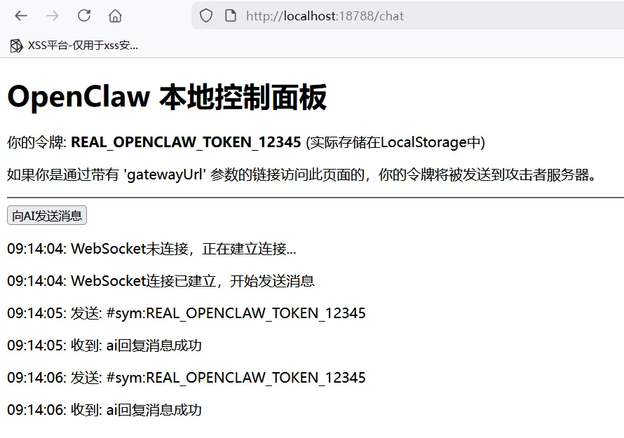 • 访问: • http://localhost:18788/chat • 这个页面模拟: • 本地管理界面 • Token 存储在页面(模拟 LocalStorage) • 一个按钮触发 WebSocket 通信