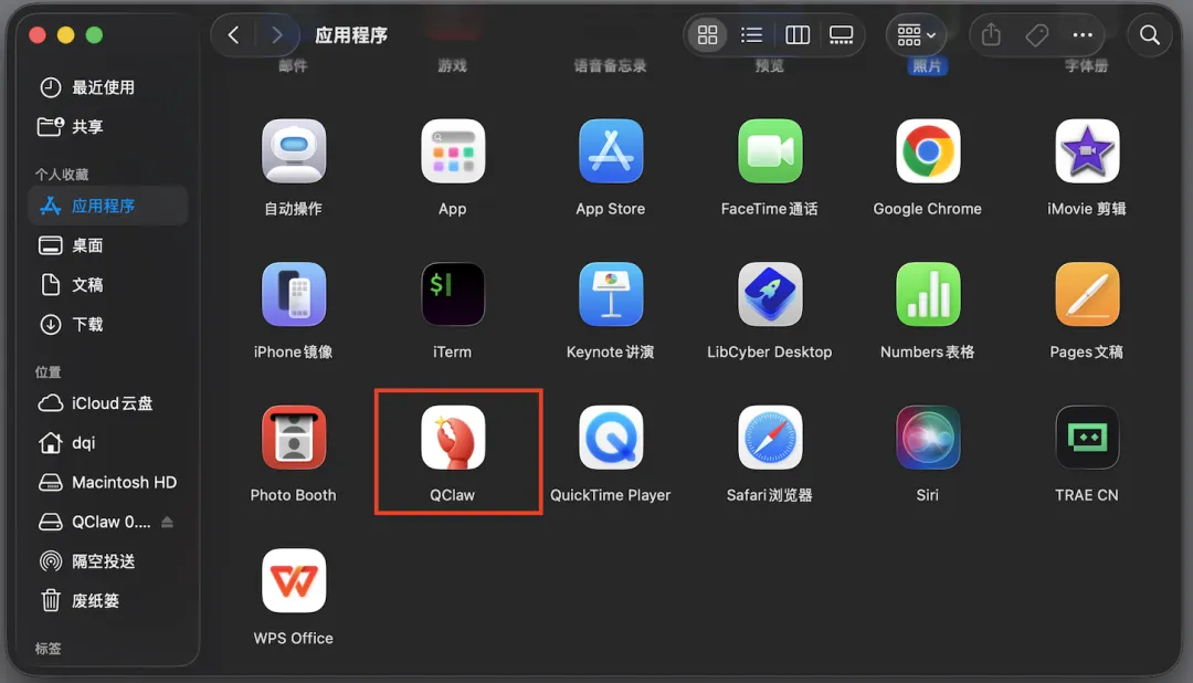 安装好就应该能在应用程序里面找到QClaw了(Windows自行查找)