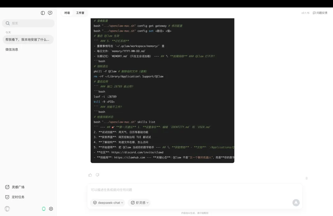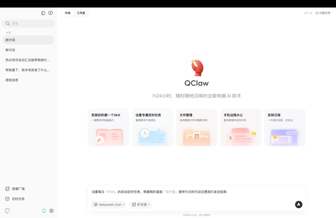 主界面:这个就是QClaw的程序页面了;左手的面板里面,记录了你和QClaw的对话。对话可能是不同渠道(简单理解就是不同的工具)发起。才安装的话应该只有两个渠道,一个是右手边的聊天界面,一个就是默认安装的微信渠道(也就是你微信里面新添加的微信Clawbot),最下面那个微信消息,就是记录的微信这个渠道的过往聊天信息。