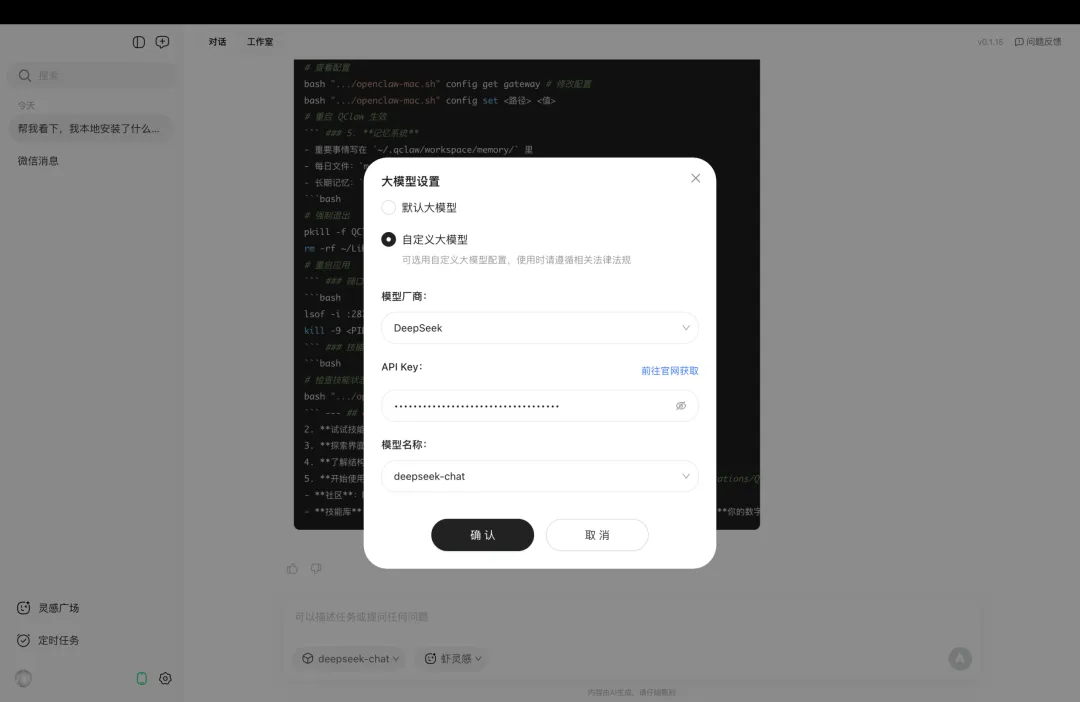 大模型:这一点很重要!!!当前QClaw是有每日Token限制的(关于Token是什么查看大语言模型 - 应用增强),好处是你不需要为Token付费,不好的地方是如果超了Token的限制,当日就没法再使用了,除非你自己再提供另外一个模型。点击右手聊天界面,下面有个默认模型按钮,点击下配置上你自己的模型就好了(关于怎么开通自己的模型/API,查看Openclaw安装教程 - Mac)。配置后就能不受QClaw日额度的限制了,因为你走的是自己的模型API,自己承担费用。