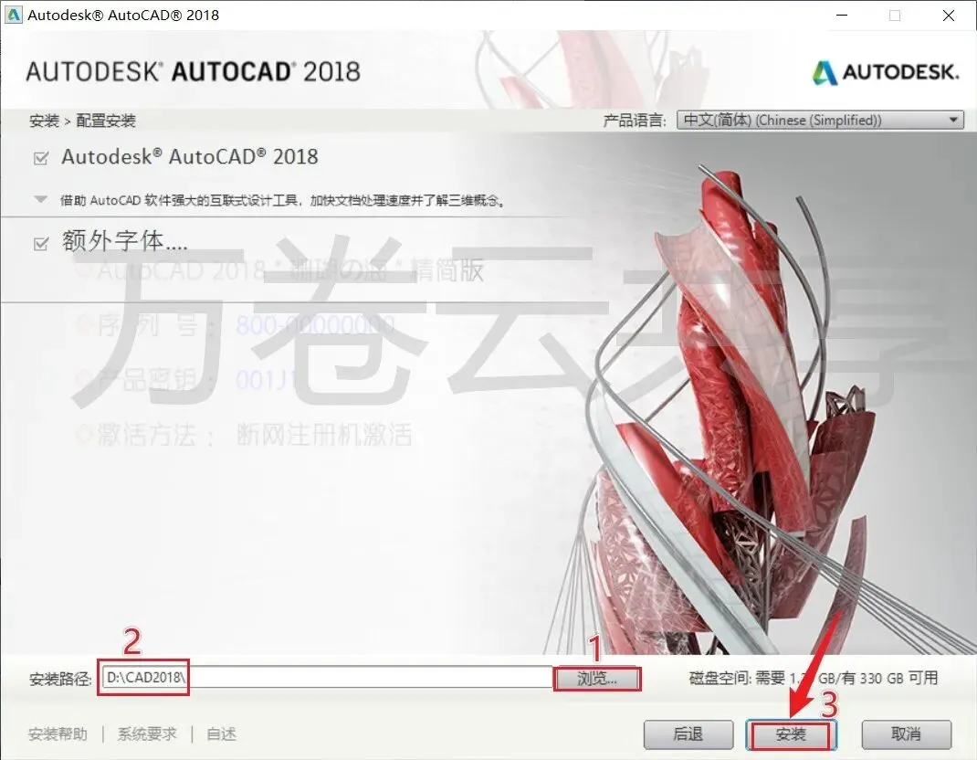 4.点击→浏览可更改安装位置(建议不要安装在C盘,可以在D盘或其它磁盘下新建一个“CAD2018”文件夹,注:安装路径中不要有中文),点击→安装