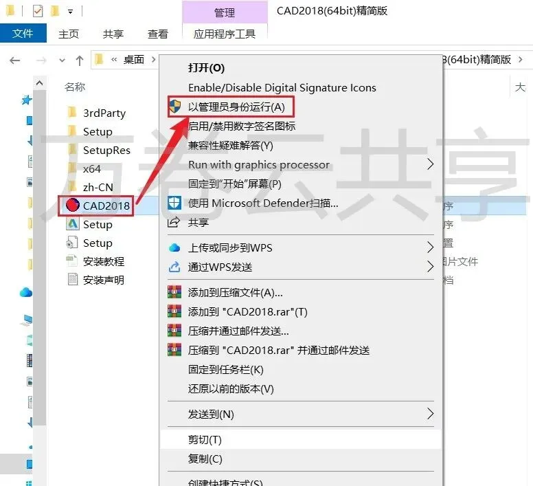 13.打开安装包解压后的CAD2018(64bit)精简版文件夹,鼠标右击→xf-adsk,选择→以管理员身份运行