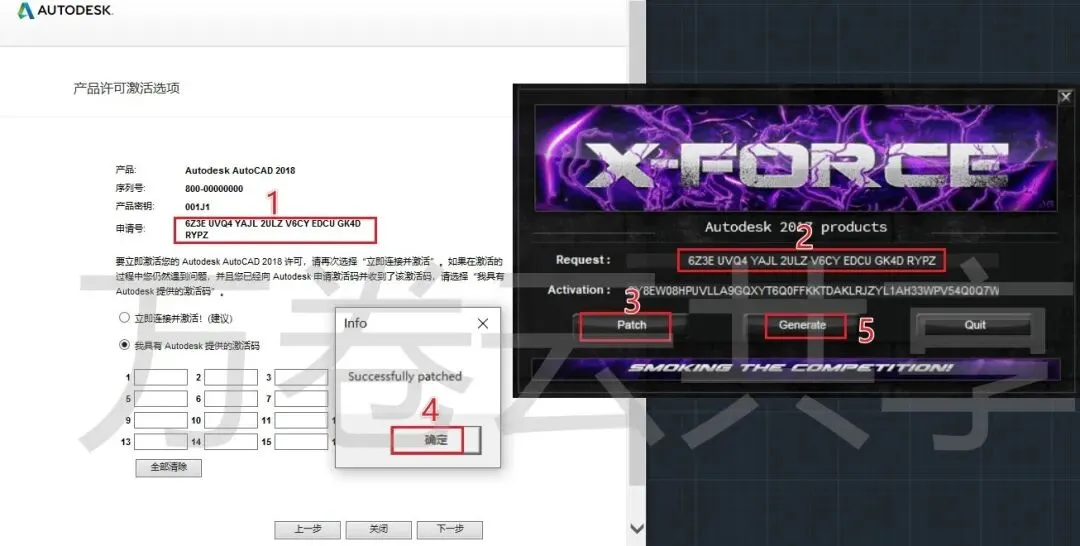 14.①使用快捷键“Ctrl+C”复制→申请号后的代码;②使用快捷键“Ctrl+V”将代码粘贴→到Request后的框中;③点击→Patch;④点击→确定;⑤点击→Generate生成激活码