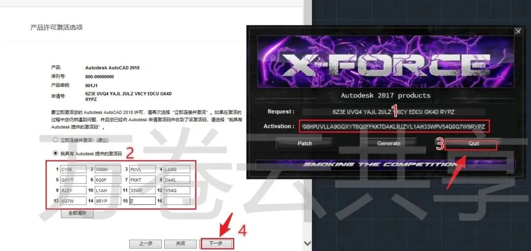 15.①使用快捷键“Ctrl+C”复制→Activation后框中的激活码;②使用快捷键“Ctrl+V”将激活码粘贴→到激活码输入框中;③点击→Quit;④点击→下一步