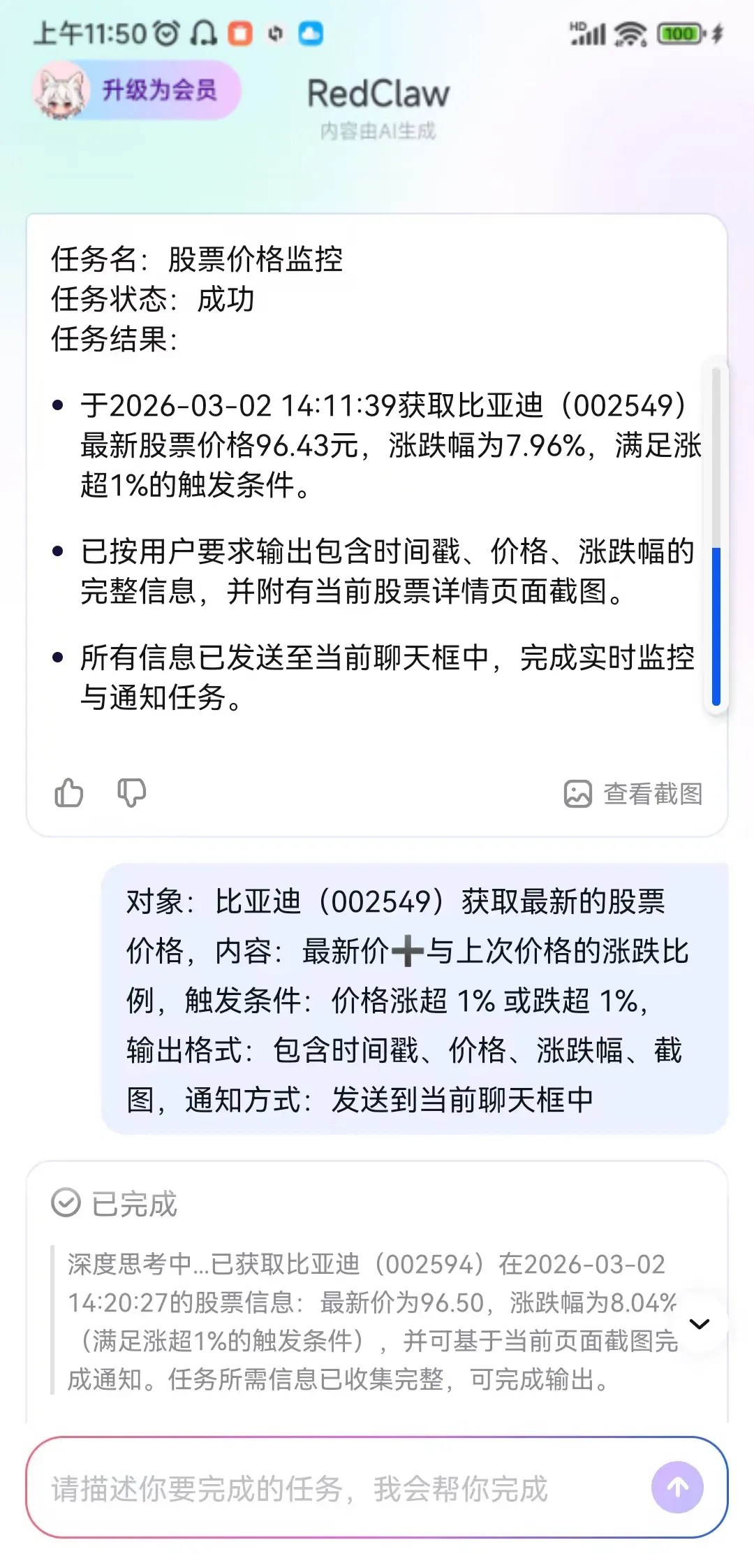指令:「从今天起,请你实时监控比亚迪(002594)的股价。关注最新价加与上次价格的涨跌比例。触发条件,价格涨超1%或跌超1%。