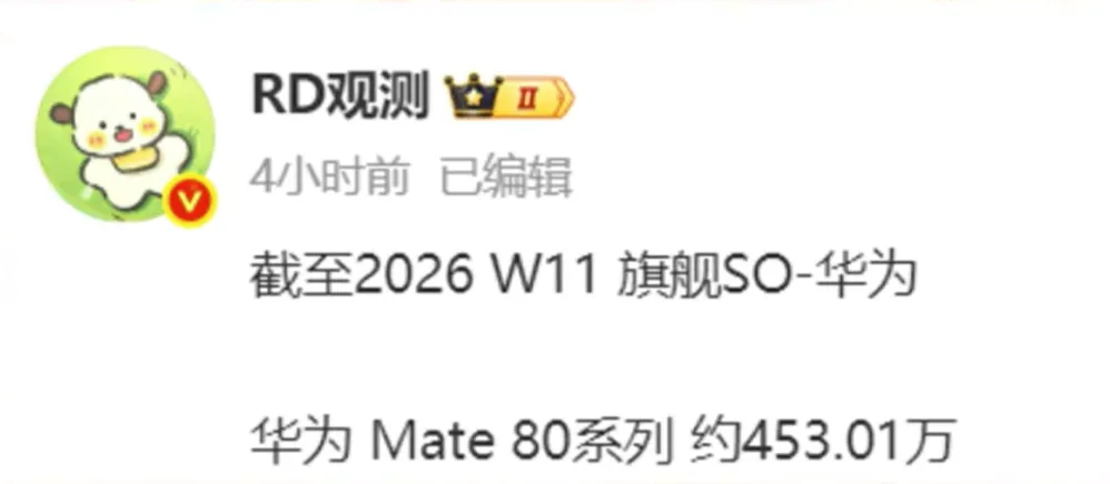 华为Mate80系列销量再创新高,截至2026年第11周,累计销量达453.01万台。新机上市后持续热销,Pro系列尤为抢手,曾给麒麟9030芯片供应带来压力,目前供应链产能改善,除Mate80 Pro Max 16G+1TB版缺货外,其余版本均有现货,配置升级且定价平稳,成为销量暴涨关键。