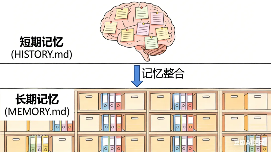 MEMORY.md:长期事实记忆,存储你的偏好、习惯、重要信息,每次对话都会注入系统提示 HISTORY.md:对话历史日志,支持搜索