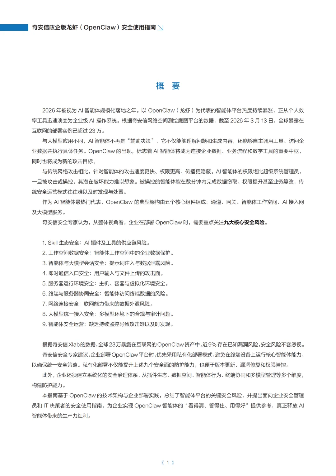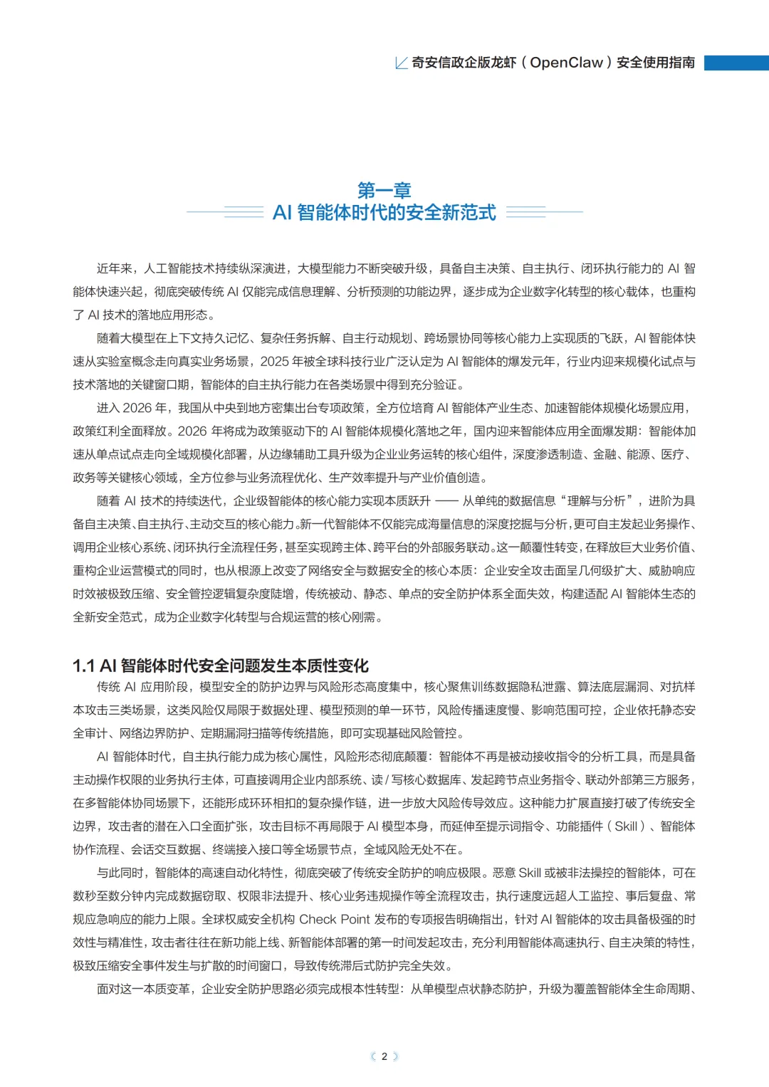 AI智能体时代企业面临的安全风险发生了哪些本质变化,如何在享受智能体带来的生产力红利的同时有效防范潜在威胁?奇安信集团发布的这份《奇安信政企版龙虾(OpenClaw)安全使用指南》,针对以上问题提供了系统性解答,为企业安全部署和使用OpenClaw智能体提供全面指导。