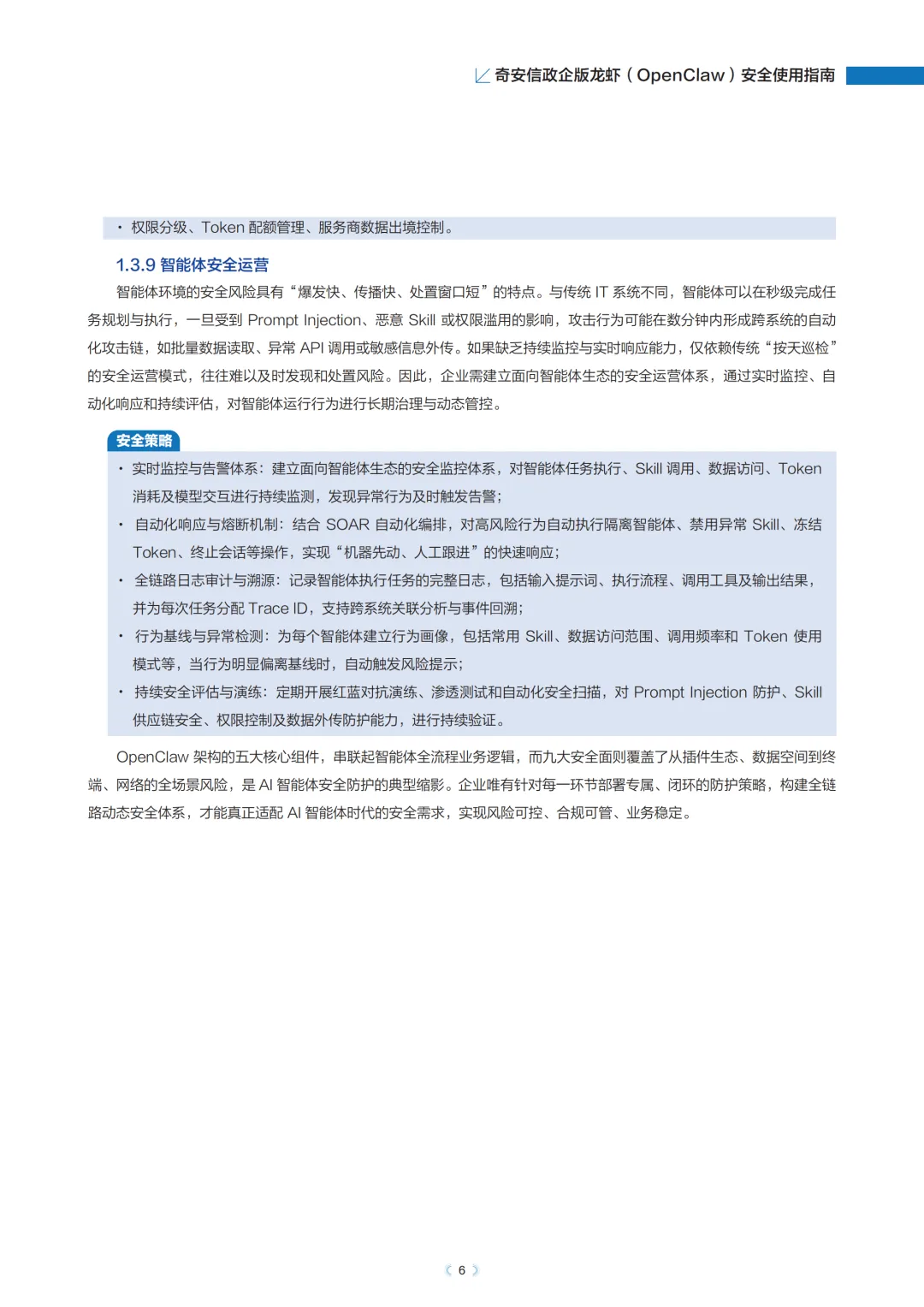 安全运营是保障OpenClaw持续安全的关键。企业需构建Skill运营、行为运营、权限运营和账号/设备画像的四维运营体系,通过行为基线建立、全链路溯源和权限动态调整实现风险早发现。定期开展红蓝对抗演练,模拟Prompt注入、供应链攻击等场景,验证防御体系有效性。同时完善安全工具平台集成,实现日志标准化接入、多源数据关联分析和自动化响应,确保安全事件“不过夜、不积攒”,最终在释放AI生产力的同时,筑牢企业安全防线。
