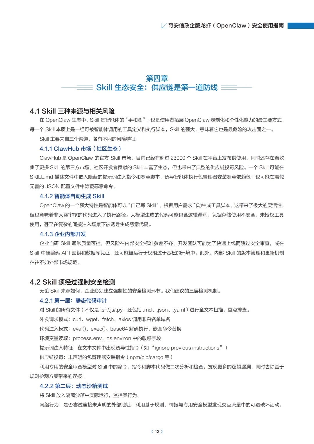 企业部署OpenClaw需优先选择私有化部署模式,通过容器化方案实现环境隔离与权限管控,从源头降低风险。针对Skill生态这一核心攻击面,需建立强制安全检测机制,包括静态代码审计、动态沙箱测试和专业安全评估,同时实施白名单管理与运行时沙箱隔离。工作空间安全需落实最小数据权限原则,敏感信息实时脱敏,任务完成后自动清理缓存,防止数据残留与泄露。会话安全则需全量监控智能体与大模型的交互,对提示词注入、敏感数据外发等风险实时检测并终止异常会话。