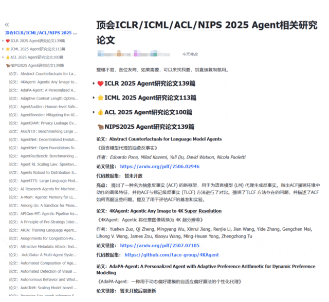 NeurIPS2025中5000多篇中稿论文Agent相关的有200多篇,占比4% ICML2025中3000多篇中稿论文Agent相关的有100多篇,占比4% ICLR2025中5000多篇中稿论文Agent相关的有200多篇,占比4% ACL2025中1600多篇中稿论文Agent相关的有100篇左右,占比6.2%