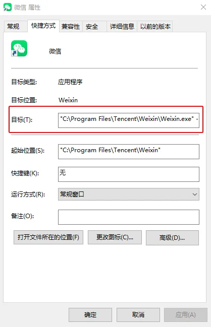 1.右键点击桌面微信快捷方式,选择“属性”,在“目标”栏中选择路径(如"C:\Program Files\Tencent\Weixin\Weixin.exe"),按Ctrl+C复制。