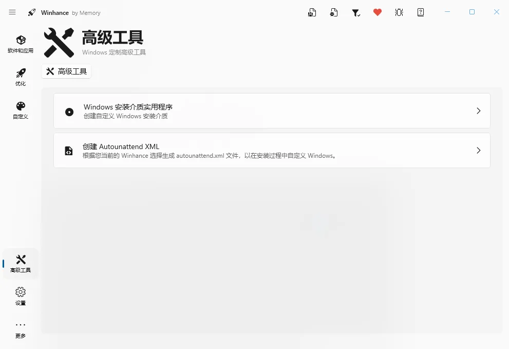 • 软件与应用管理 (💿) ◦ 深度清理:将 Windows 应用、旧版功能和可选功能分门别类,提供带有解释性图例的可搜索界面,让你清楚知道每一项是做什么的,一键移除不需要的软件。 ◦ 外部应用集成:内置 WinGet COM API,可以直接通过 Winhance 安装各类实用程序(如浏览器、多媒体工具等),实现软件生态的统一管理。 • 系统优化 (🚀) ◦ 全方位调校:从隐私设置、游戏性能优化到 Windows 更新策略,再到电源计划和声音设置,每一个细节都可通过拨动开关轻松控制。 ◦ UAC 管理:自定义用户账户控制通知级别,平衡安全性与操作流畅度。 • 个性化定制 (🎨) ◦ 视觉重塑:提供 Windows 主题选择器(深色/浅色模式),并允许你对任务栏、开始菜单和浏览器进行深度自定义。 ◦ 快速导航:所有设置均支持快速搜索和导航,省去在层层文件夹中翻找的时间。 • 高级部署工具 (🛠️) ◦ 创建自定义 ISO:利用 WIMUtil 工具,你可以基于当前系统创建包含自定义驱动的 Windows 安装镜像。 ◦ 无人值守安装:自动生成 autounattend.xml文件,配合配置文件管理功能,让你在新电脑上快速复刻完美的系统环境。