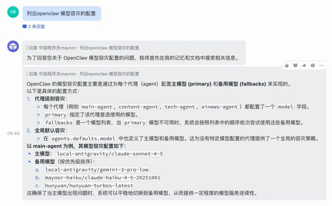 # 查看当前配置openclaw config get agents.defaults.model# 输出示例:{"primary": "anthropic/claude-opus-4-6","fallbacks": ["openai-codex/gpt-5.3-codex","google-antigravity/claude-opus-4-6-thinking"]}