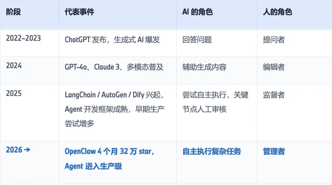 从 2023 年的对话式 AI 到 2025 年的早期 Agent 尝试,人始终是任务执行的主体,AI 在旁边辅助。2026 年初 OpenClaw的出现使得这个格局开始松动。